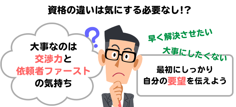 大切なことは、依頼者の立場になって相談に乗ってくれるか、最後まで責任をもって対応してくれるかどうかであり、資格のグレードの違いは問題ではないはず。