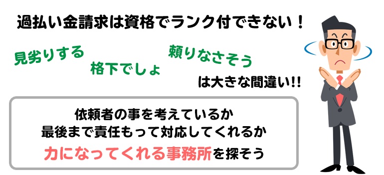 確かに知名度やステータス、専門領域の幅広さでは負けてしまかもしれませんが、過払い金請求に関していえば、単純に資格の違いだけでランク付できるものではありません。