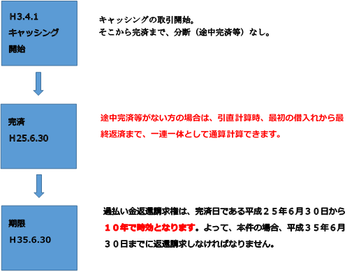 一方、長きにわたる業者との取引の中で、退職金等まとまったお金が入ったので、一括返済され解約し、しばらくの間、キャッシングをすることなく過ごし、その後、キャッシングを再開し、しばらく後に最終返済に至ったというような場合に過払い請求する上で期限が問題となります(以下、下記図参照)。