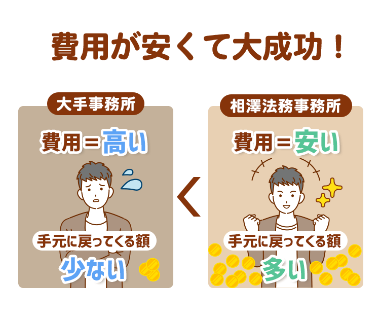 佐々木行雄相澤法務事務所では、基本報酬を頂いておりませんし、成功報酬は19.8~25.3%(税込)で相場(22~27.5%)より低く抑えています。お客さまのように、相対的に安かったとおっしゃられる方は少なくありません。また、よその事務所で取られることもあるオプション費用は一切頂きません! これは何も自慢ではなく当たり前ですが、結構有名なところが取ったりするので、ちゃんと調べたうえで選んだほうがいいんですね。