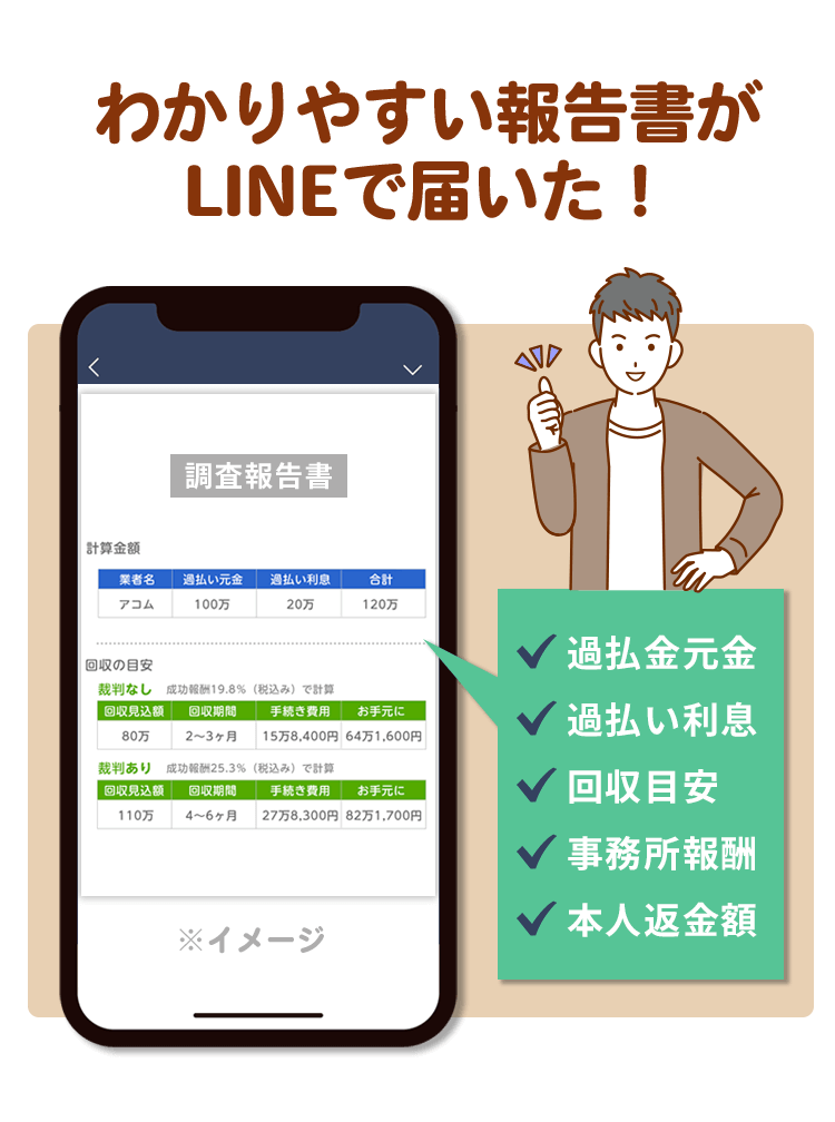 佐々木行雄報告や連絡はLINEツールなどを使い、スピード感をもって行っております! 一般的に、過払い金額の調査結果はざっくり金額だけ伝えたり、口頭のみの説明だけで済ませているところも多いんですね。でもそれではお客様もわかりにくく、後から確認が必要になることがあります。