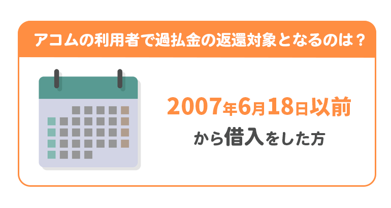 アコムを利用している場合、特定の期間に借入を行いすでに返済が完了している、もしくは返済を続けている人が過払金の対象となります。