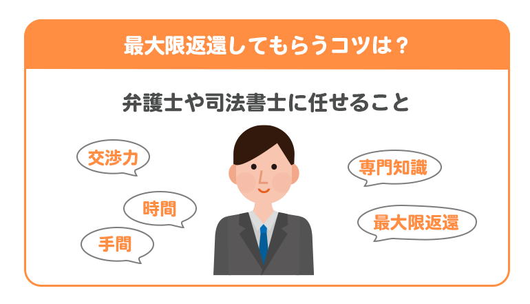 自分で交渉を行うと過払金が少なくなってしまう可能性もあるので、過払金を最大限返還してもらいたいなら専門家に任せたほうが安心して交渉を進められます。