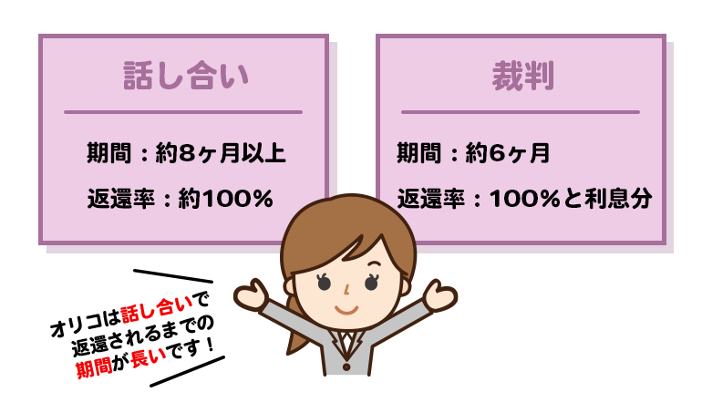 しかし、オリコに関しては、裁判をして解決する方が返還期間は短くなっています。