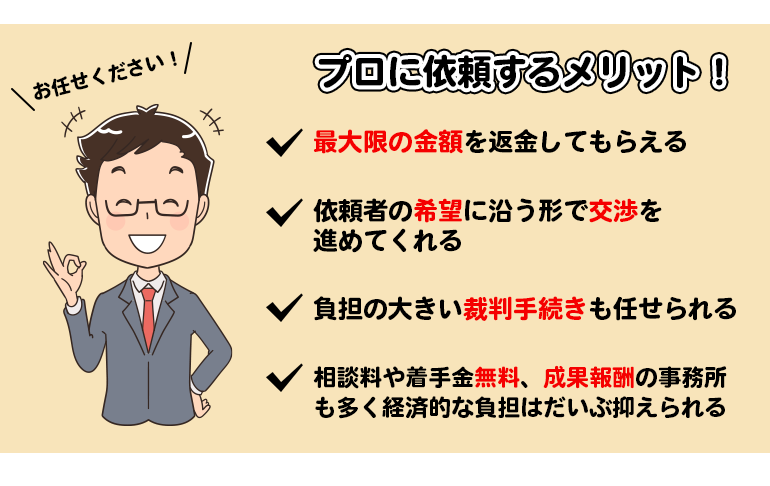 スムーズに過払金請求を進めたい場合や、最大限の金額を返金してもらいたい場合は、弁護士や司法書士などのプロに依頼をするのも合理的な方法です。