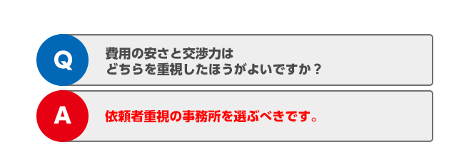 費用の安さと交渉力は、どちらも大切であり、いずれの要素も兼ね備える事務所をみつけてください。