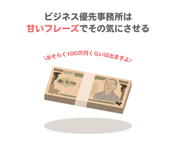 電話では、料金や回収見込みについて説明しないかわりに、「おそらく100万円くらいは出ますよ」と、甘いフレーズを使ってその気にさせる手法が散見されます。