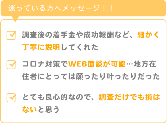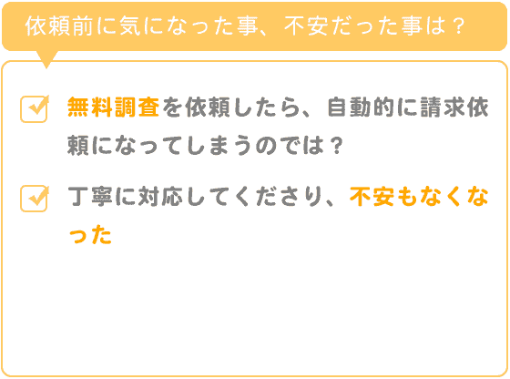 不安だったことは、無料調査を依頼したら、自動的に請求依頼になってしまうのでは?と思っていましたが、丁寧に対応してくださり、不安もなくなりました。