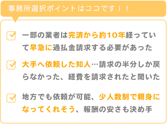 周囲に、大手の事務所へ過払金請求や、債務整理を依頼している知人がいて、請求の半分しか戻ってこなかった話や、経費として逆にお金を請求された話を聞き、大手へ依頼するのは難しいなぁと思いました。