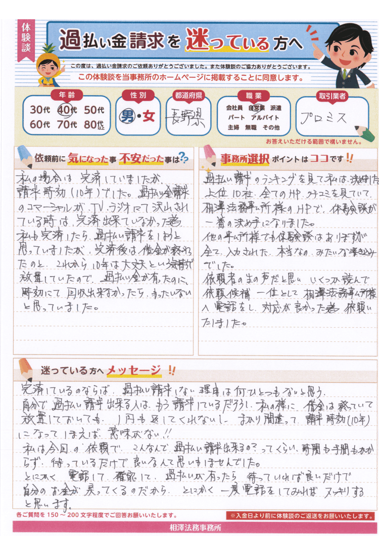 過払い請求のランキングを見て私は、決めました。上位10社、全てのHP、クチコミを見ていて、相澤法務事ム所様のHPで、体験談が一番の決め手になりました。