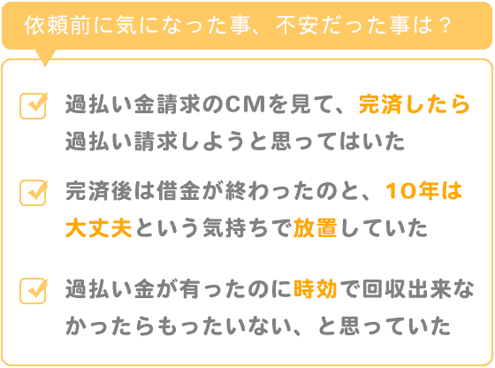 過払い金請求のコマーシャルがTV、ラジオにて沢山されている時は、完済出来ていなかった為、私も完済したら、過払い請求をしようと思っていましたが、完済後は借金が終わったのと、これから10年は大丈夫という気持ちで放置していたので、過払い金が有ったのに、時効にて回収出来なかったら、もったいないと思っていました。