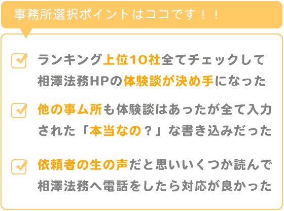 依頼者の生の声だと思いいくつか読んで依頼候補一位として相澤法務事ム所様へ電話をし、対応が良かった為依頼いたしました。