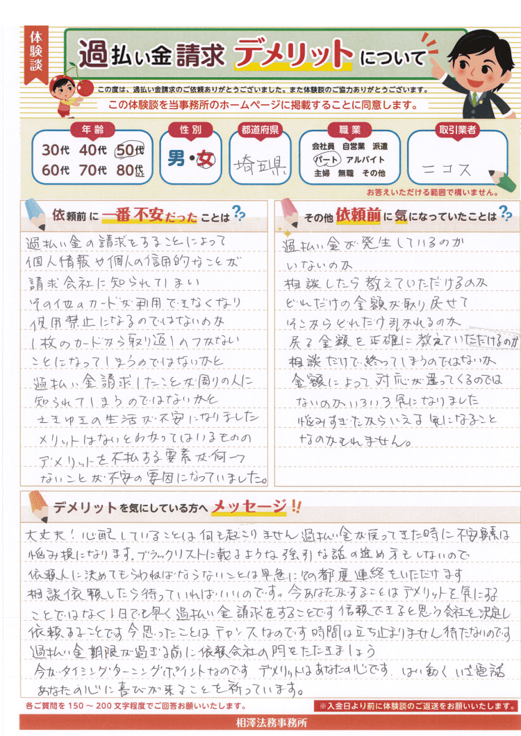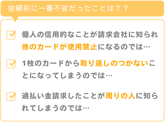 過払い金の請求をすることによって個人情報や個人の信用的なことが請求会社に知られてしまい、その他のカードが利用できなくなり使用禁止になるのではないのか、1枚のカードから取り返しのつかないことになってしまうのではないかと、過払い金請求したことが周りの人に知られてしまうのではないかと、さきゆきの生活が不安になりました。