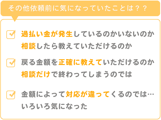 過払い金が発生しているのかいないのか、相談したら教えていただけるのか、どれだけの金額が取り戻せてそこからどれだけ引かれるのか、戻る金額を正確に教えていただけるのか、相談だけで終わってしまうのではないか、金額によって対応が違ってくるのではないのかいろいろ気になりました。