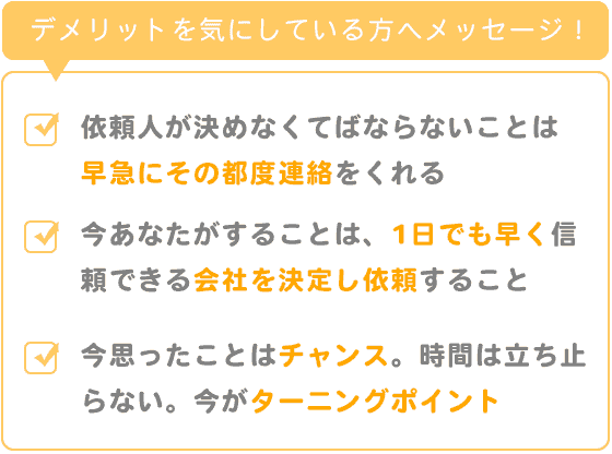 ブラックリストに載るような強引な話の進め方もしないので、依頼人に決めてもらわねばならないことは早急にその都度連絡をいただけます。