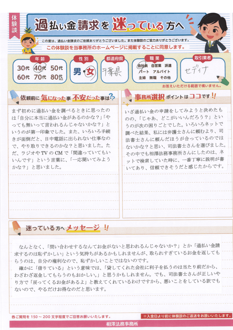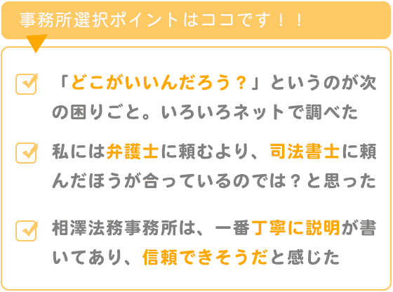 その中でも相澤法務事務所さんにしたのは、ネットで検索していた時に、一番丁寧に説明が書いてあり、信頼できそうだと感じたからです。