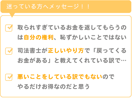 なんとなく、「問い合わせするなんてお金がないと思われるんじゃないか?」とか「過払い金請求するのは恥ずかしい」という気持ちがあるかもしれませんが、取られすぎているお金を返してもらうのは、自分の権利なので、恥ずかしいことではないのです。