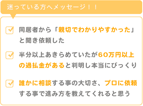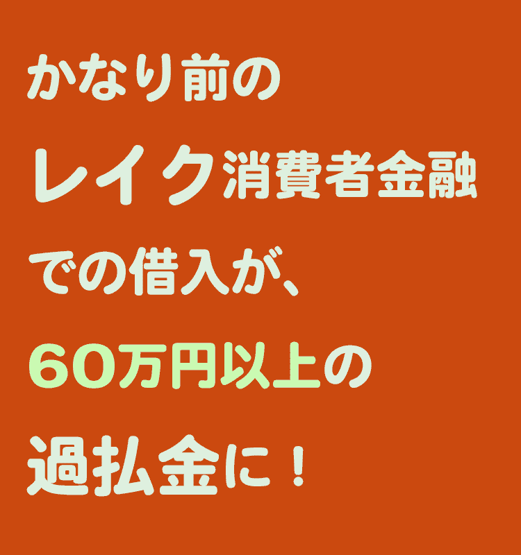 かなり以前に消費者金融での借入返済だった為、半分以上あきらめていましたが、60万円以上の過払金がある事が判明して本当にびっくりしたのが本音です。