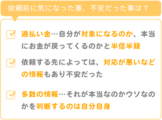 TVやインターネットで色々な過払い金の情報がありましたが、自分が対象になるのか、本当にお金が戻ってくるのかと半信半疑でした。