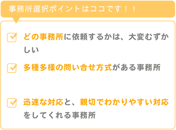 迅速な対応と、親切でわかりやすい対応をしてくれる事務所が一番です。