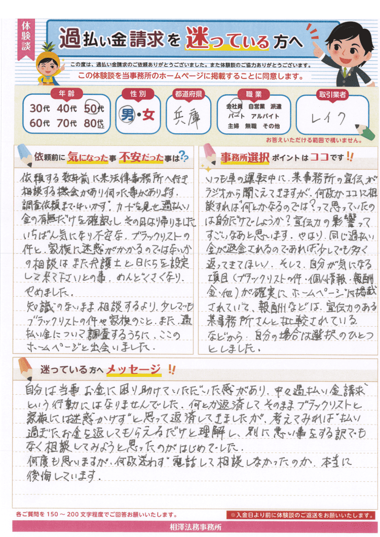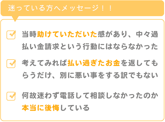 何とか返済してそのままブラックリストと家族には迷惑かけずと思って返済してきましたが、考えてみれば払い過ぎたお金を返してもらえるだけと理解し、別に悪い事をする訳でもなく相談してみようと思ったのがはじめでした。