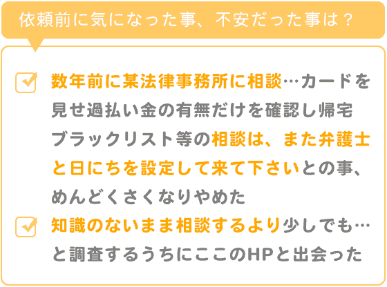知識のないまま相談するより、少しでもブラックリストの件や家族のこと、また、過払い金について調査するうちに、ここのホームページと出会いました。