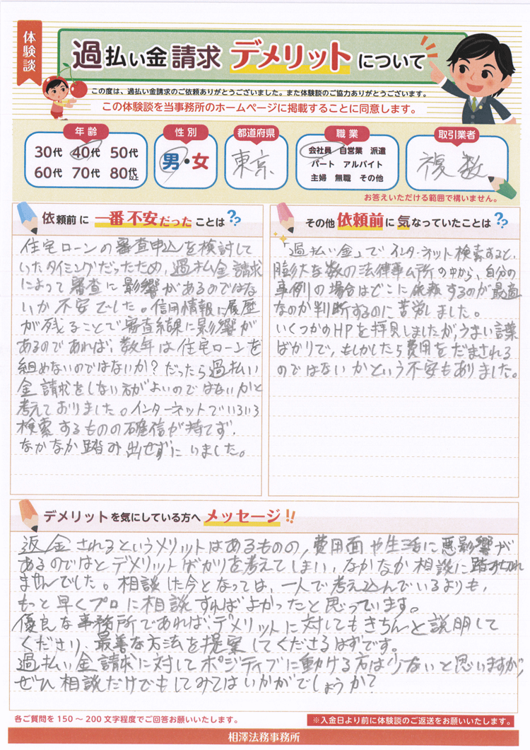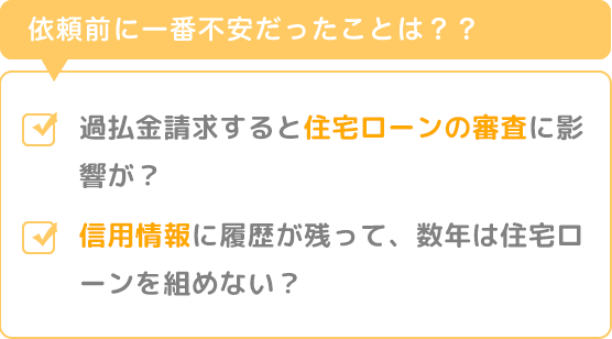 住宅ローンの審査申込を検討していたタイミングだったため、過払金請求によって審査に影響があるのではないか不安でした。