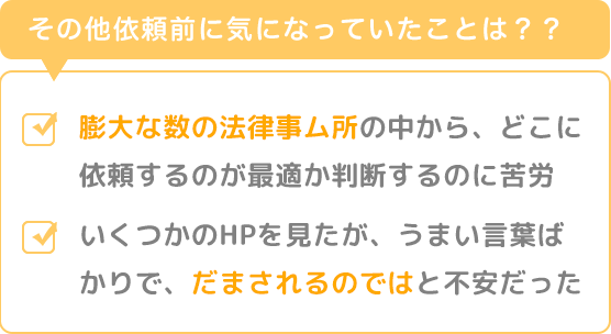 「過払い金」でインターネット検索すると、膨大な数の法律事ム所の中から、自分の事例の場合はどこに依頼するのが最適なのか判断するのに苦労しました。