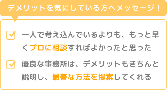 優良な事務所であれば、デメリットに対してもきちんと説明してくださり、最善な方法を提案してくださるはずです。