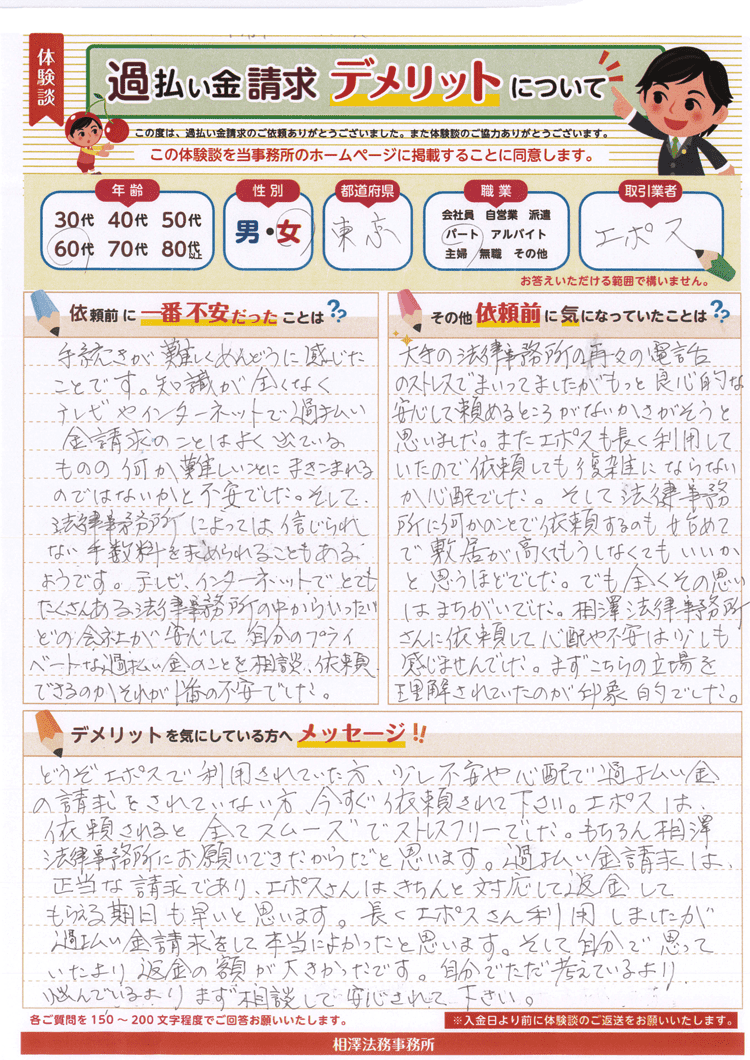 長くエポスさん利用しましたが過払い金請求をして本当によかったと思います。