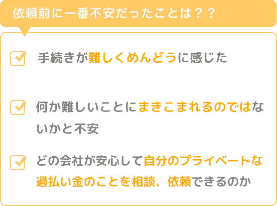 知識が全くなくテレビやインターネットで過払い金請求のことはよく出ているものの何か難しいことにまきこまれるのではないかと不安でした。