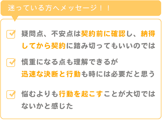 ホームページでは心配しなくても大丈夫的なことを書いていても実際契約後は…という話も少なからず聞きますし、お金に関することなので慎重になる点も理解できますが、迅速な決断と行動も時には必要かと思います。