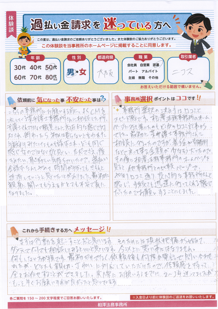 こちらの事務所にお願いする前に、よくCMを流している某弁護士事務所さんに相談した所、弁護士さんではない職員さんに高圧的な感じで対応され、断ったら初めは要らないと言われた手数料みたいなものも請求され、どこも同じ感じなのではないかと思い、ただでさえ、後ろめたい、恥ずかしい気持ちでいたので、過払い金請求なんてやめて時間がかかってもきちんと返済していこうと思ったことがありました。