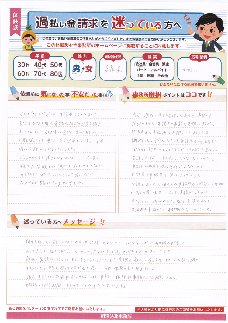 何年も前、もう覚えていないぐらいの記憶のレベルで、心のどこかであの時のお金は戻ってきたりしないのか…とやんわり思っていたところ、テレビのCMやネットでよく、過払い金請求について目にするようになり、また、実際に過払い金請求した人の話を聞き、もしかしたら自分も返ってくるかもと思い今回依頼してみました。