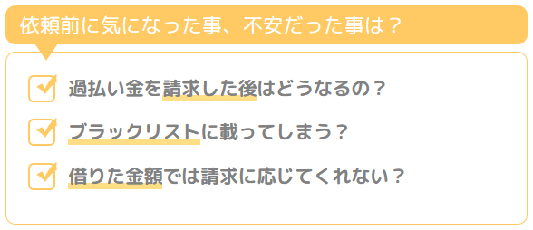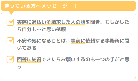 請求することに不安や気になることは、事前に依頼する事務所に聞いてみて納得してからお願いするのも一つの手だと思います。