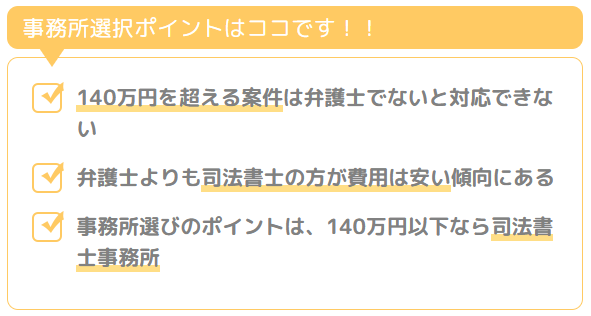 よって、事務所選びのポイントは140万円以下なら、弁護士よりも司法書士事務所で、手数料の安いところです。