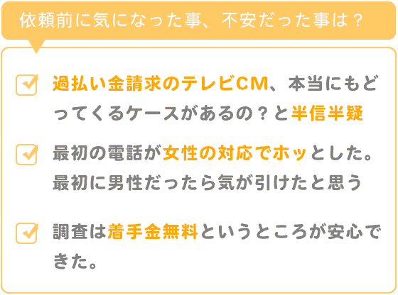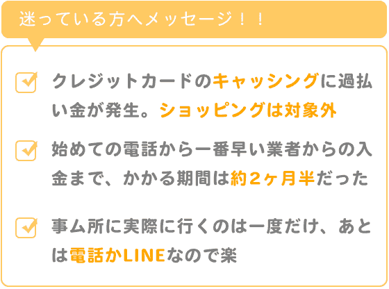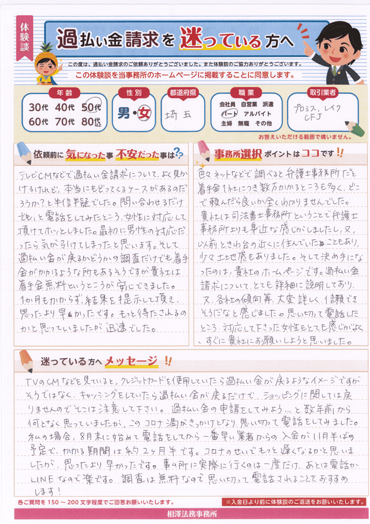 そして過払い金が戻るかどうかの調査だけでも着手金がかかるような所もあるそうですが貴社は着手金無料というところが安心できました。