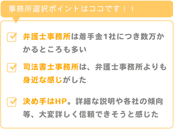 色々ネットなどで調べると弁護士事務所だと着手金1社につき数万かかるところも多く、どこで頼んだら良いか全くわかりませんでした。