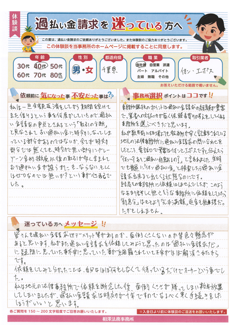 私が数年前に相場よりも報酬が安く記載されている地元の法律事務所に過払い金請求の問い合わせをしたところ、電話口では業者はイオンとエポスですと伝えたら「イオンへ?あそこ過払い利息あるの?」と言われました。