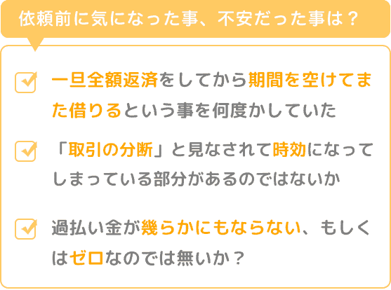 私は一旦全額返済をしてから期間を空けてまた借りるという事を何度かしていたので、過払い金請求の争点とされるという「取引の分断」と見なされて古い過払い金に時効になってしまっている部分があるのではないか、全てが時効部分では無くても、時効で無い部分にグレーゾーン金利撤廃以後の取引が多く含まれており過払い金が幾らかにも、ならない、もしくはゼロなのでは無いか?という事が心配でした。