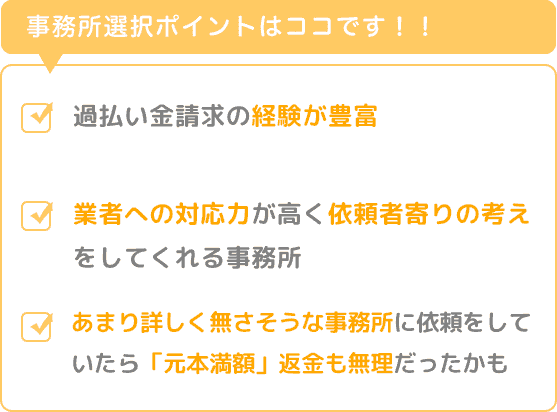 事務所選択のポイントは過払い金請求の経験が豊富で、業者への対応力が高く依頼者寄りの考えをしてくれる事務所を選ぶべきだと思います。