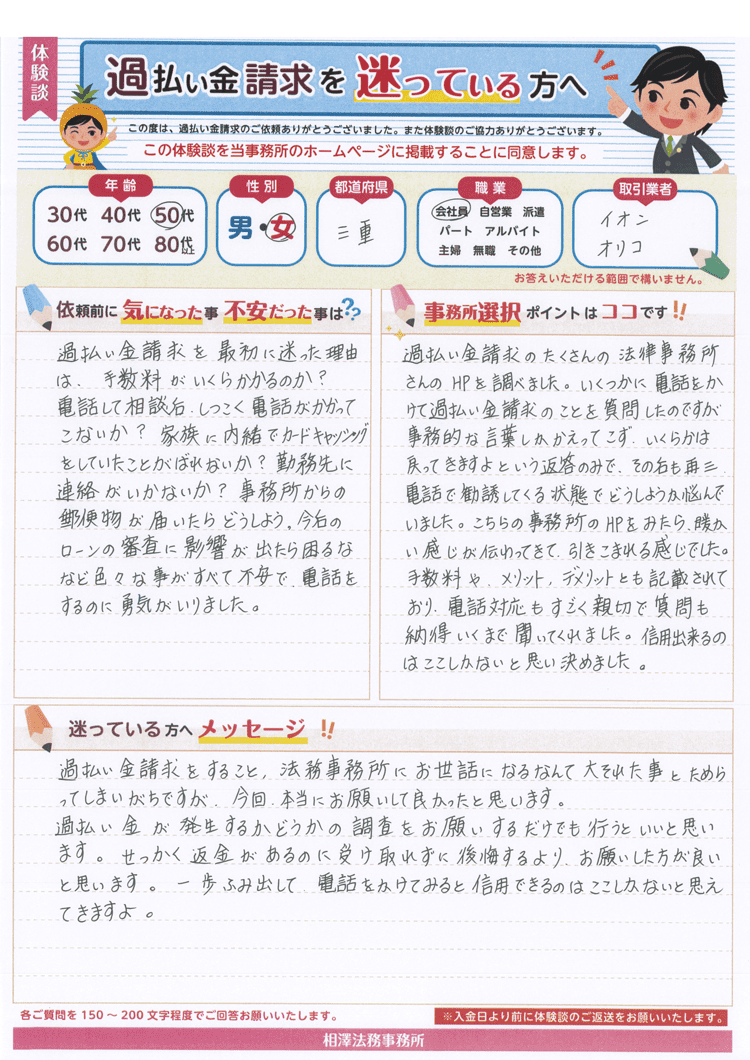 過払い金請求をすること、法務事務所にお世話になるなんて大それた事とためらってしまいがちですが、今回、本当にお願いして良かったと思います。