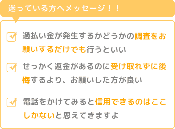 いくつかに電話をかけて過払い金請求のことを質問したのですが事務的な言葉しかかえってこず、いくらかは戻ってきますよという返答のみで、その後も再三電話で勧誘してくる状態でどうしようか悩んでいました。