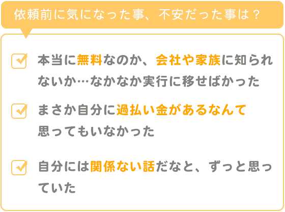 自分で過払い金請求をしてみる前までは、どうしても、本当に無料で行えるのか、会社や家族に知られずに行えるのかが不安で、なかなか実行に移す事ができませんでした。