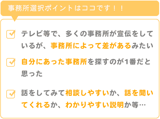 あとは、連絡をしてみて、事務所の方と話をしてみて、相談しやすいか話をきちんと聞いてくれるのかどうかわかりやすい説明をしてくれるかなど