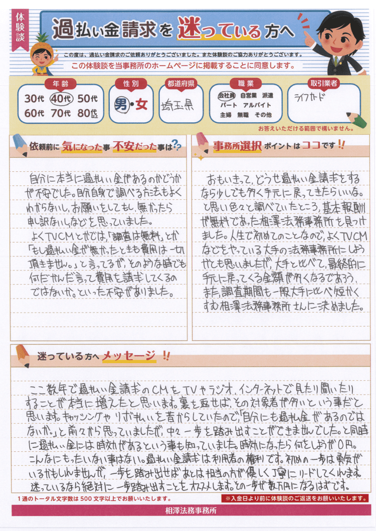 おもいきって、どうせ過払い金請求をするなら少しでも多く手元に戻ってきたらいいな。と思い色々と調べていたところ、基本報酬が無料であった相澤法務事務所を見つけました。