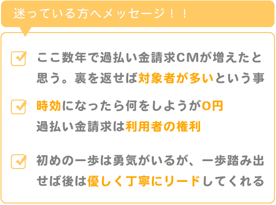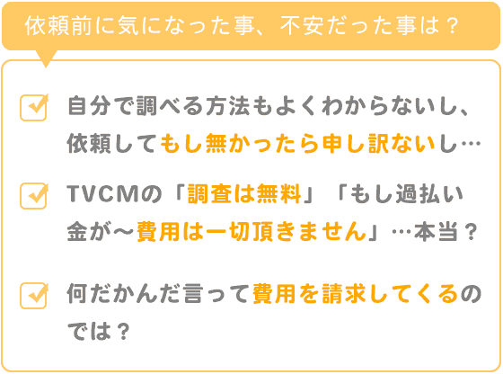 よくTVCMとかでは、「調査は無料」とか「もし過払い金が無かったときも費用は一切頂きません。」と言ってるが、そのような時でも何だかんだ言って費用を請求してくるのではないか。といった不安がありました。