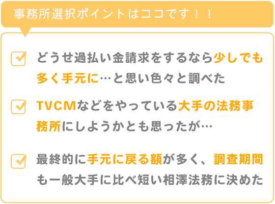 人生で初めてのことなので、よくTVCMなどをやっている大手の法務事務所にしようかとも思いましたが、大手と比べて、最終的に手元に戻ってくる金額が多くなるであろう、また、調査期間も一般大手に比べ短くすむ相澤法務事務所さんに決めました。