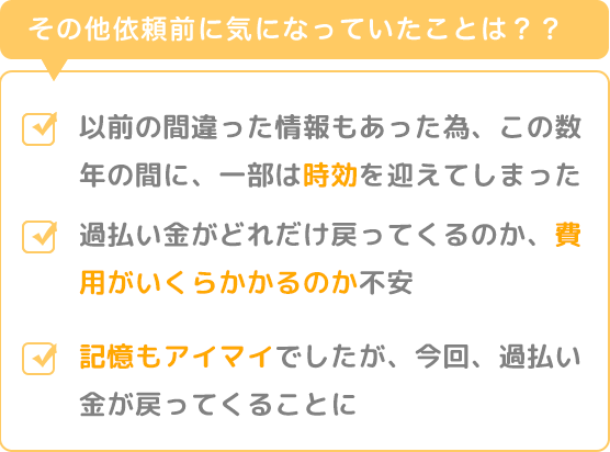 以前の間違った情報もあった為、この数年の間に、時効を迎えてしまった分もあり、過払い金がどれだけ戻ってくるのか、費用がいくらかかるのか不安でした。