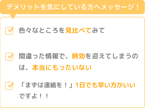テレビのCMなどでもよく耳にしますが、「まずは連絡を!」1日でも早い方がいいですよ!!